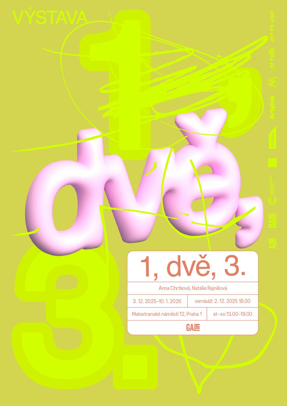 Jedna – jako individualita, jedinec, tápající na průsečíku umění a akademie. Dvě – jako Natálie Rajnišová a Anna Chrtková, dva umělecké/scénografické výzkumy, vzájemná podpora a konzultace. Tři – jako nejmenší jednotka kolektivu, vstupující do nových vztahů, nadhled, zpětná vazba.
