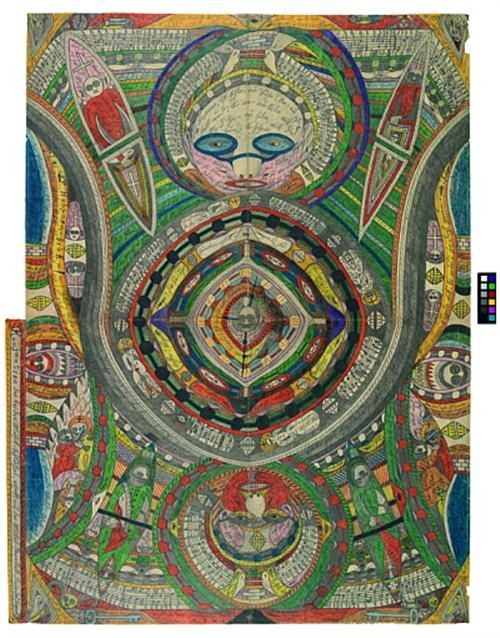 Švýcar Adolf Wölfli (1864–1930) strávil většinu života v léčebně pro duševně nemocné. Svoji sociální izolaci a duševní nemoc transformoval v nesmírný kreativní potenciál. Stvořil komplexní paralelní vesmír, pro nějž vymyslel novou geografii, historii i nové řády číslovek. Jeho celoživotní dílo „Obří Stvoření Svatého Adolfa” sestává ze 45 sešitů o 25 000 stranách textů, hudebních partitur, číselných záznamů a především pak 1600 kreseb a 1640 koláží. Přestože Wölfliho ikonografie vychází z kulturních prvků, překračuje je a naplňuje novým významem platným v jeho osobní mytologii.