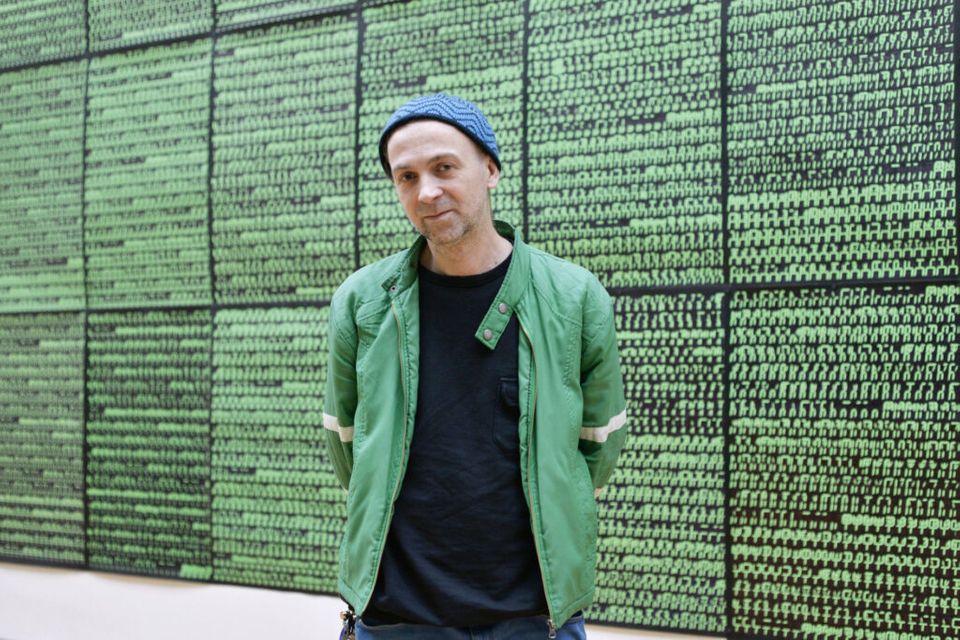 Michal Cáb a dílo Dušana Zahoranského ve výstavě Poetics of Encryption v Galerii Rudolfinum. © Galerie Rudolfinum, foto: Tereza Kunderová