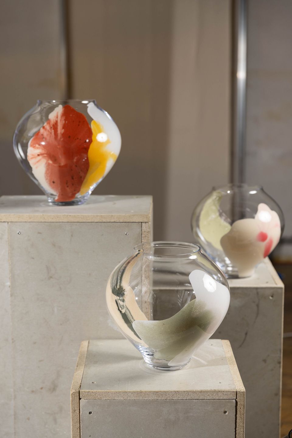 Ústředním objektem výstavy je reinterpretace tradiční korejské moon jar, jež se v tomto případě stává nositelem společné formy. Sklo, navržené Byoungchanem Yunem a vyfouknuté českými sklářskými mistry, se setkává s malbou Lucie Jindrák Skřivánkové, jež na jeho povrchu samovolně proudí, usazuje se, vzdoruje kontrole. Její malby vznikají bez zásahu štětce, skrze gravitaci, náhodu a důvěru v proces, který nelze plně řídit. Tento přístup se stává protiváhou k designérské preciznosti Yuna, který však i ve své tvorbě hledá křehkost, jemnost a napětí.