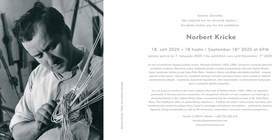 Výstavu Norberta Krickeho v Galerii Závodný kurátorsky zaštítil pan Hans-Peter Riese. Práce pro instalaci uspořádal způsobem, jenž koncepčně retrospektivně sleduje tvorbu autora v časové ose a přináší tak českému publiku ucelený soubor jeho prací. Tento konvolut je vystaven v České republice poprvé. Výstavu bylo možné uskutečnit díky patronátu paní Sabine Kricke – Güse a její rodiny, bez této pomoci by nebylo možné výstavu uskutečnit.