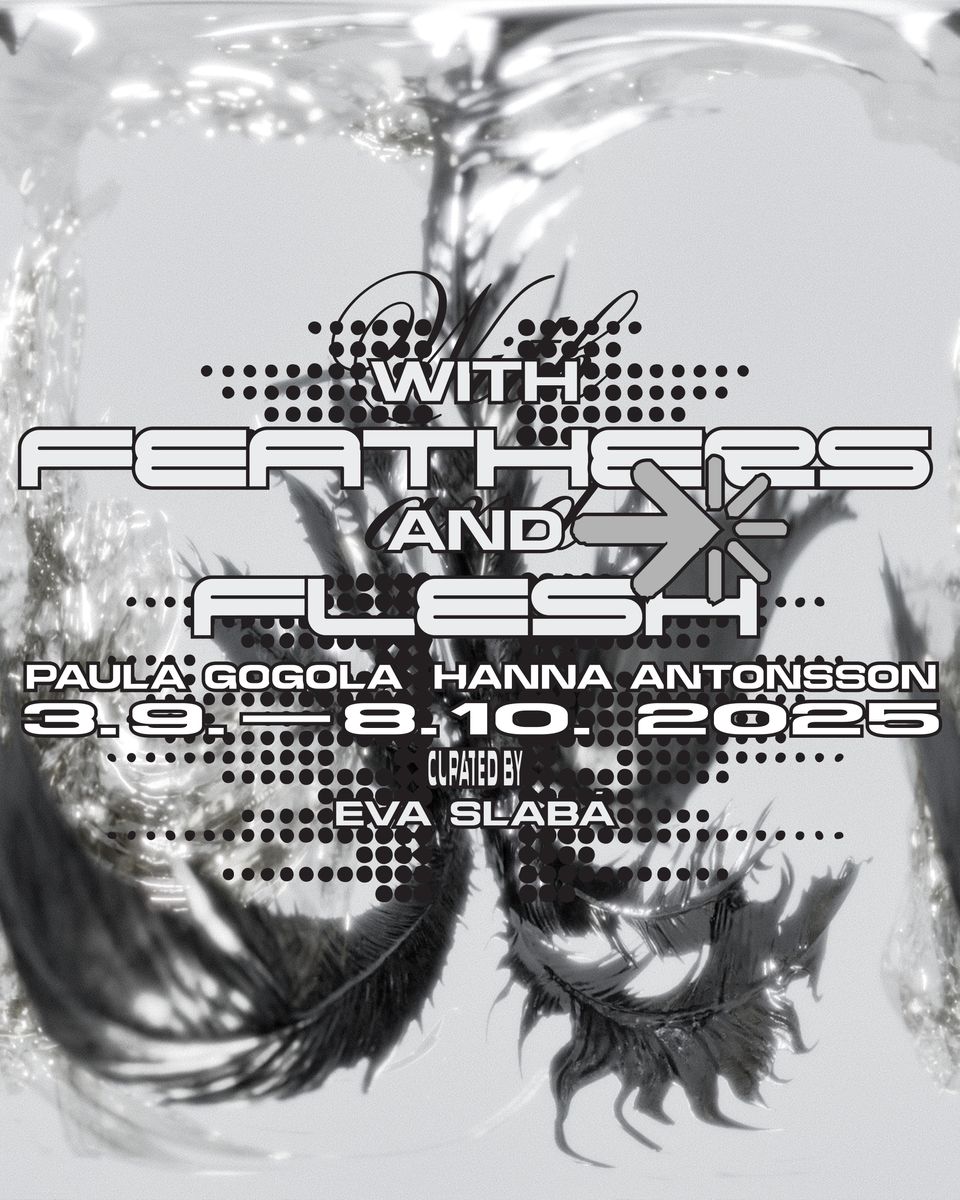 Společná výstava With Feathers and Flesh dvojice Paula Gogola a Hanna Antonsson zkoumá proměnu organických těl a vztah mezi přírodním a technologickým. Antonsson vytváří kinetické sochy z racčích křídel a automobilových částí, jež reflektují náhodné střety na göteborských silnicích. Gogola se ve své malířské praxi zaměřuje na transfeminní pozice a konstrukci identity skrze tělesnou modifikaci a queer zkušenost. Obě autorky propojuje symbol anděla – u Antonsson v podobě strojových křídel, u Gogoly jako transhumanní figura odporu, přerodu a léčení.