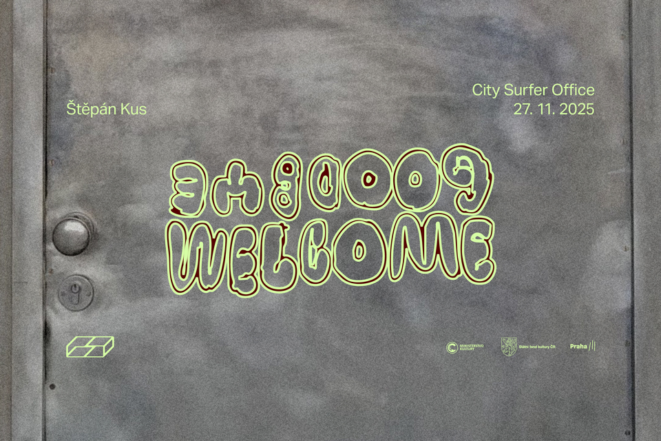 Výstava WELCOME/GOODBYE ostravského umělce působícího v Praze Štěpána Kuse akcentuje dva úryvky textu z digitálních platforem.
