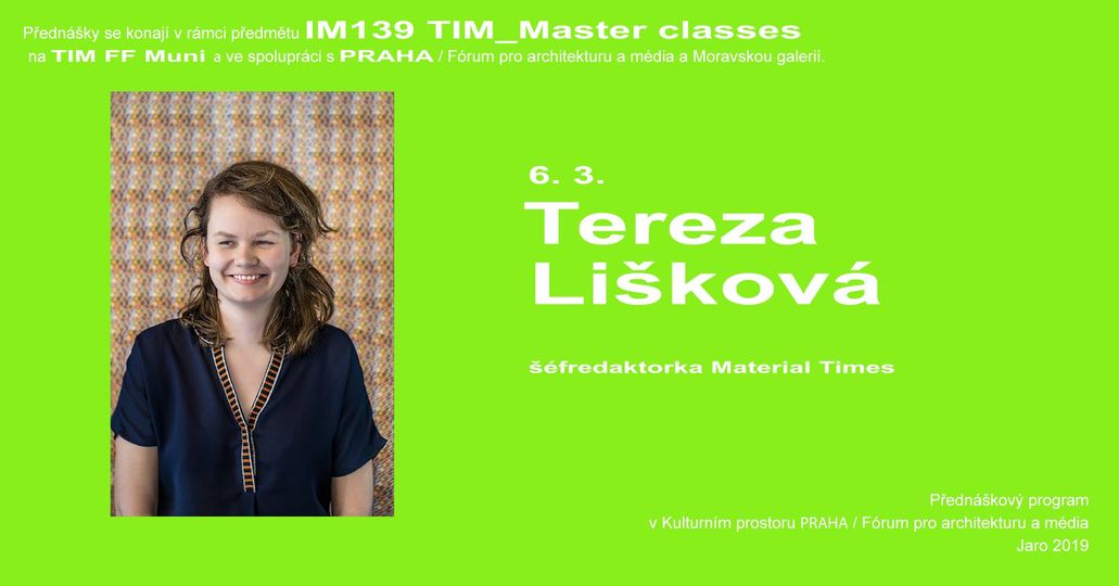 Nové materiály. Jsou tu s námi! Cihly z hub, fošny z měsíčního dřeva, pohřbené haldy textilu, virtuální částice prachu, vypreparovaný pštrosí žaludek, bakteriální sliz s příměsí rostlinných vláken, list papíru z kombuchy, skla, která žádný pták neviděl, půdní bakterie nakrmené fritovacím olejem, mumifikované lišejníky, které už nic nečekají. Co pro nás nové materiály znamenají? Čím jsme pro ně my? Kdo s čím zachází? Vzniká s každým novým kusem hmoty nový svět? Přednáška šéfredaktorky Material Times Terezy Liškové, jež je součástí cyklu IM 138 TIM_Master classes (předmět vyučován v rámci oboru Teorie interaktivních médií na FF Muni v spolupráci s PRAHA / Fórum pro architekturu a média a Moravskou galerií). Vstup zdarma. Material Times jsou hmatatelným čtením v prchavé digitální době. Propojují tvůrčí svět architektury, výtvarného umění, designu a řemeslné výroby se světem nových materiálů a technologií.