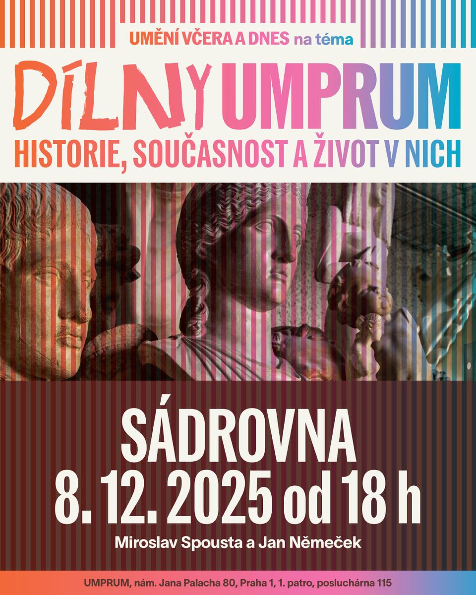 Závěrečná přednáška cyklu Umění včera a dnes na téma Dílny UMPRUM. Historie, současnost a život v nich bude věnovaná Sádrovně. Její hostorii, tvorbu a život v ní přiblíží Miroslav Spousta a Jan Němeček.