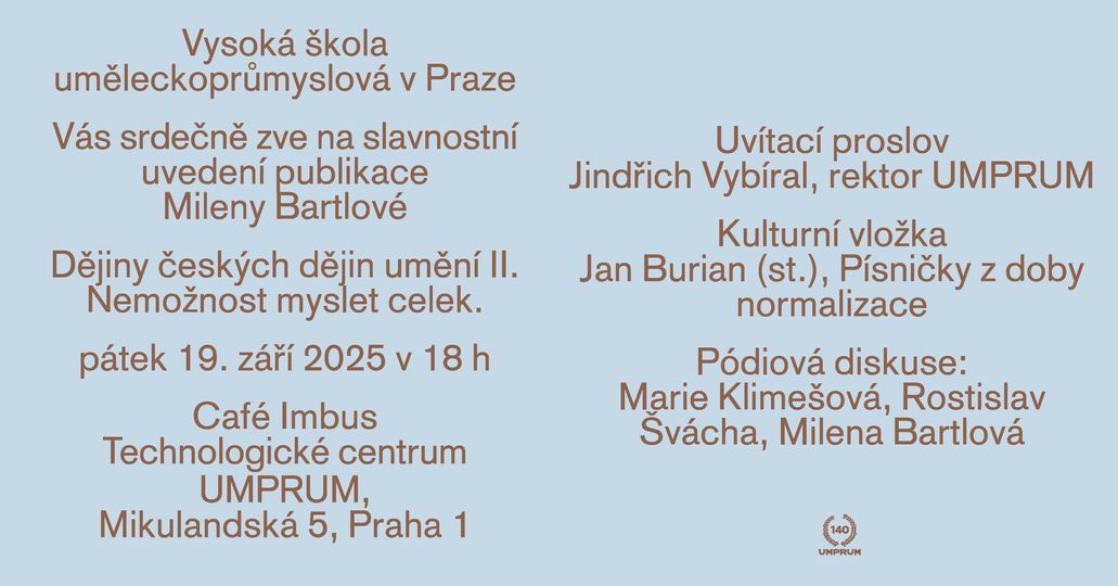 Vysoká škola uměleckoprůmyslová v Praze slavnostně uvede knihu Mileny Bartlové Dějiny českých dějin umění II. 1970-1990. Nemožnost myslet celek.